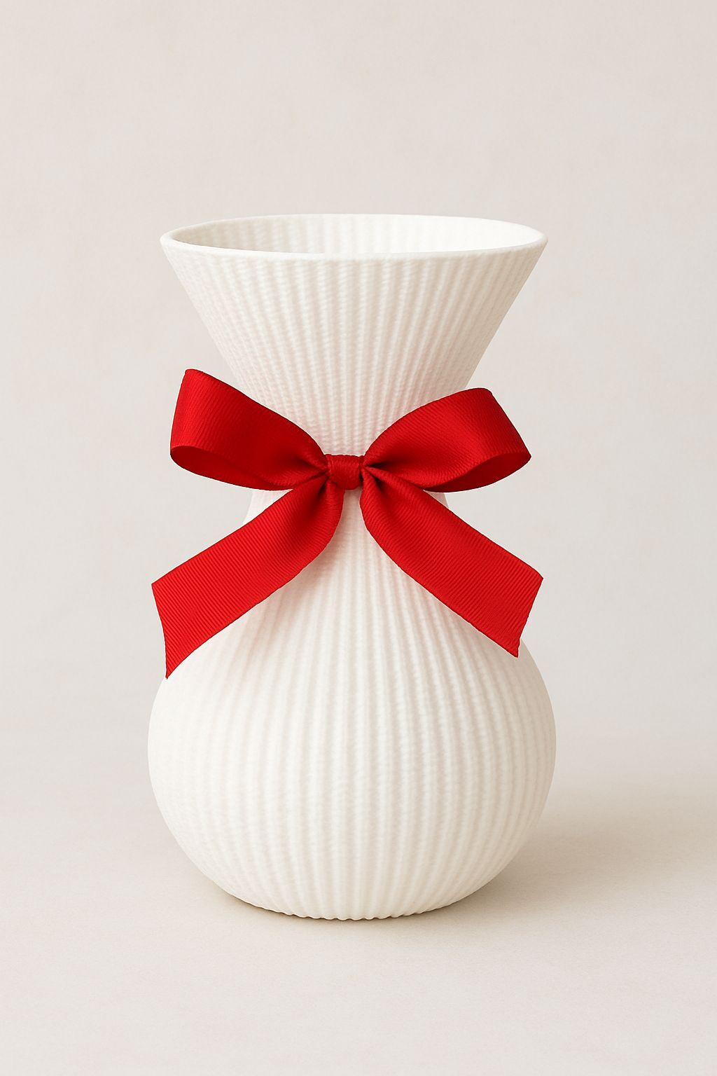 Dodaj swojemu domowi nutę wyjątkowej elegancji. Ten piękny wazon o subtelnie żłobionej fakturze zachwyca minimalistyczną formą, którą przełamuje urocza czerwona kokarda. Idealny na świeże kwiaty, suche bukiety lub jako samodzielna dekoracja – prezentuje się wspaniale w salonie, sypialni czy jadalni.